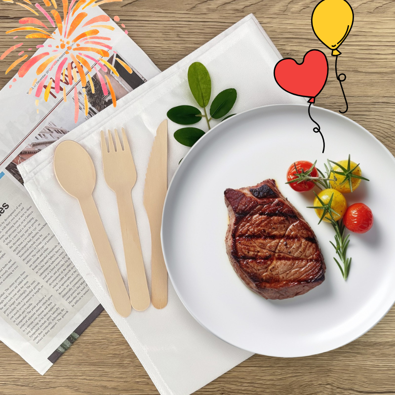 To complete the setting, disposable wooden cutlery provides a clean, eco-friendly option that suits buffets, catering events, and takeaway meals alike.